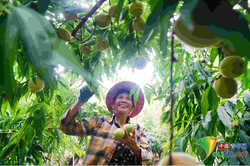 清晨的露水还未散去,走进江西省龙南市武当镇金叶果园,种植户叶观柱已带着工人钻进桃林开启采摘工作。眼下正值鹰嘴桃成熟采摘的旺季,园内一片繁忙景象。2000多棵鹰嘴桃树枝繁叶茂,饱满的果实挂满枝头,散发着诱人的果香,丰收的喜悦洋溢在果园的每一个角落。
